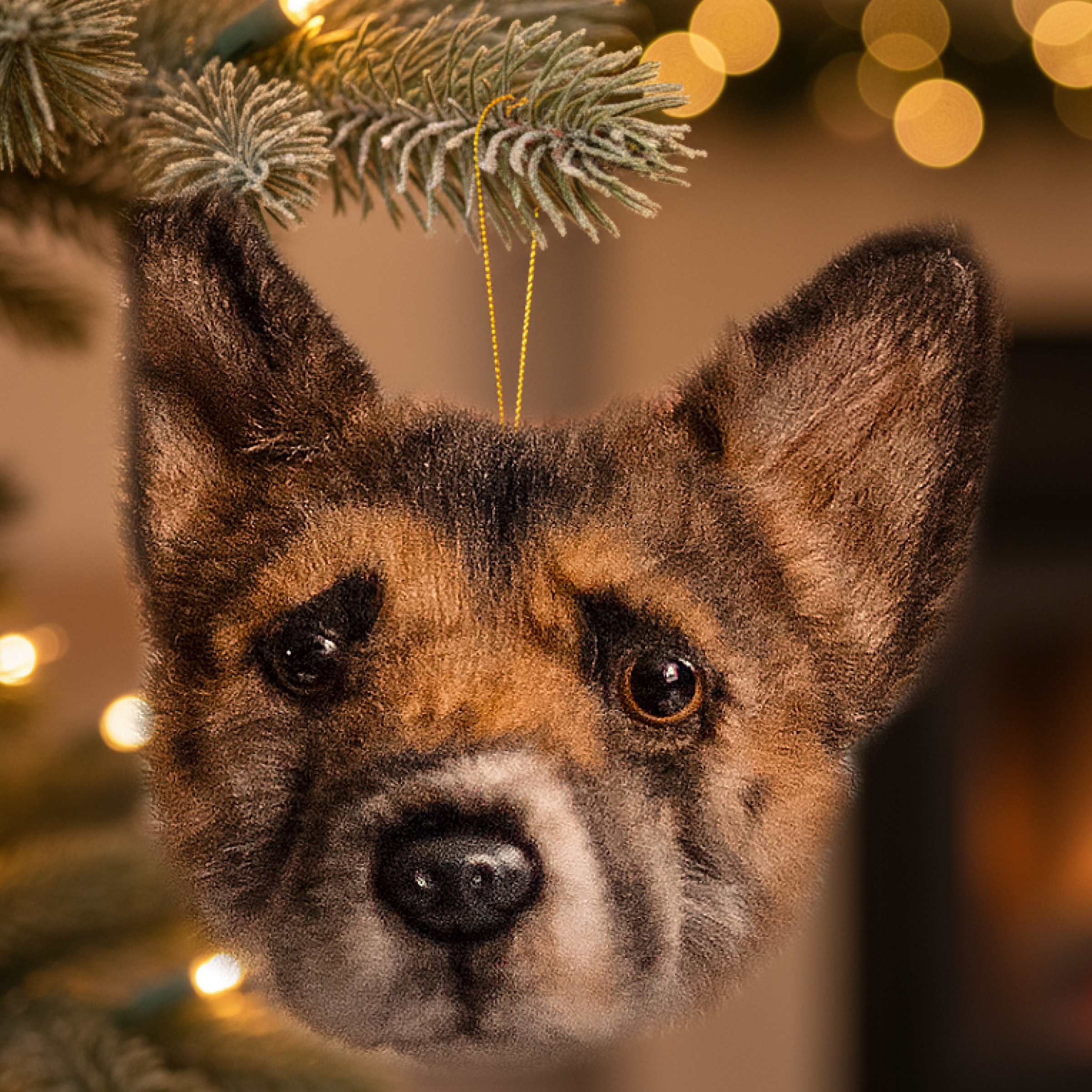 A close-up shot shows a hand wearing a green and red striped sweater hanging a custom Christmas ornament shaped like the head of a German Shepherd dog on a brightly lit Christmas tree.