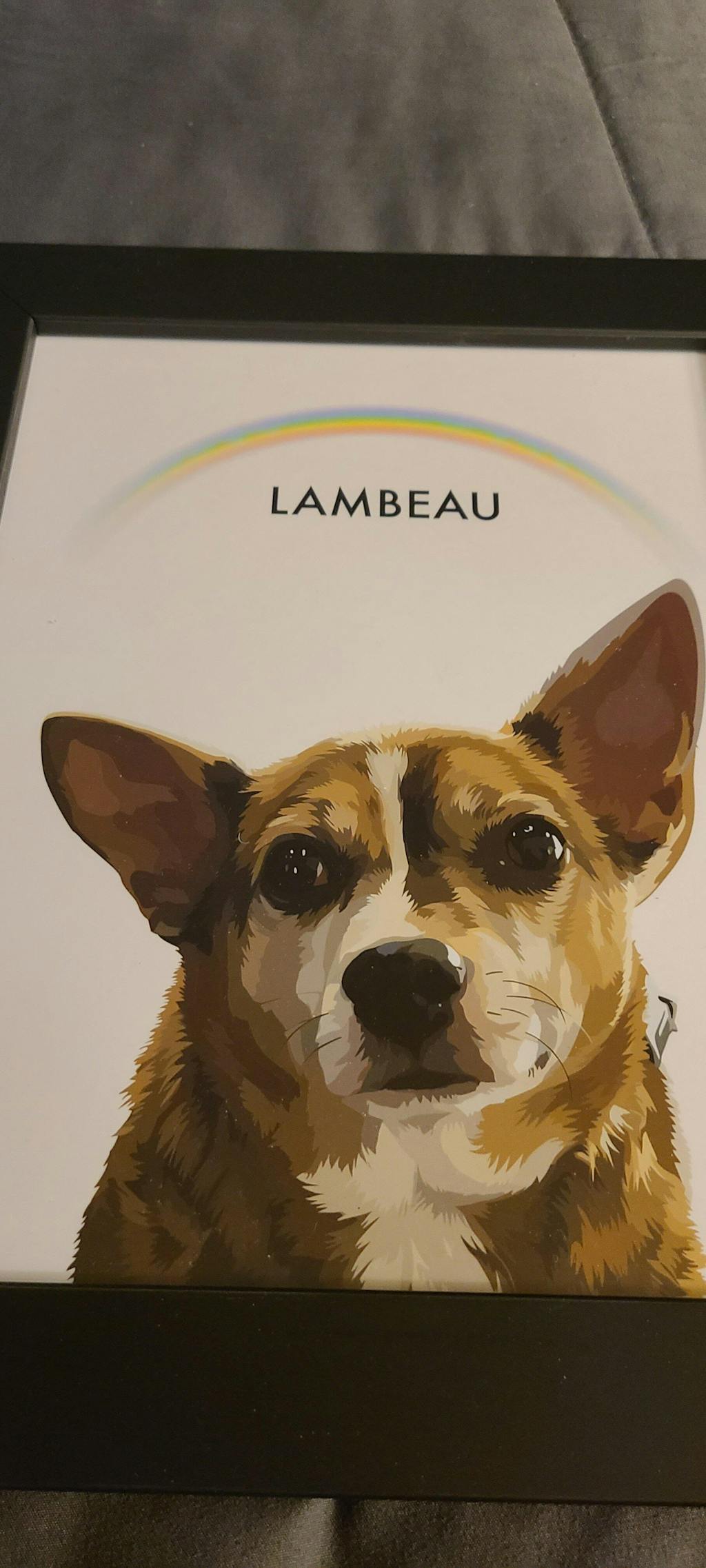 I lost my Lambeu very unexpectedly & I am absolutely shattered. I found CC on Insta. I sent in a photo & they created the m9st beautiful portrait with the rainbow over his beautiful head. Although I am still crying every day, I have this stunning portrait of my goodest boy.