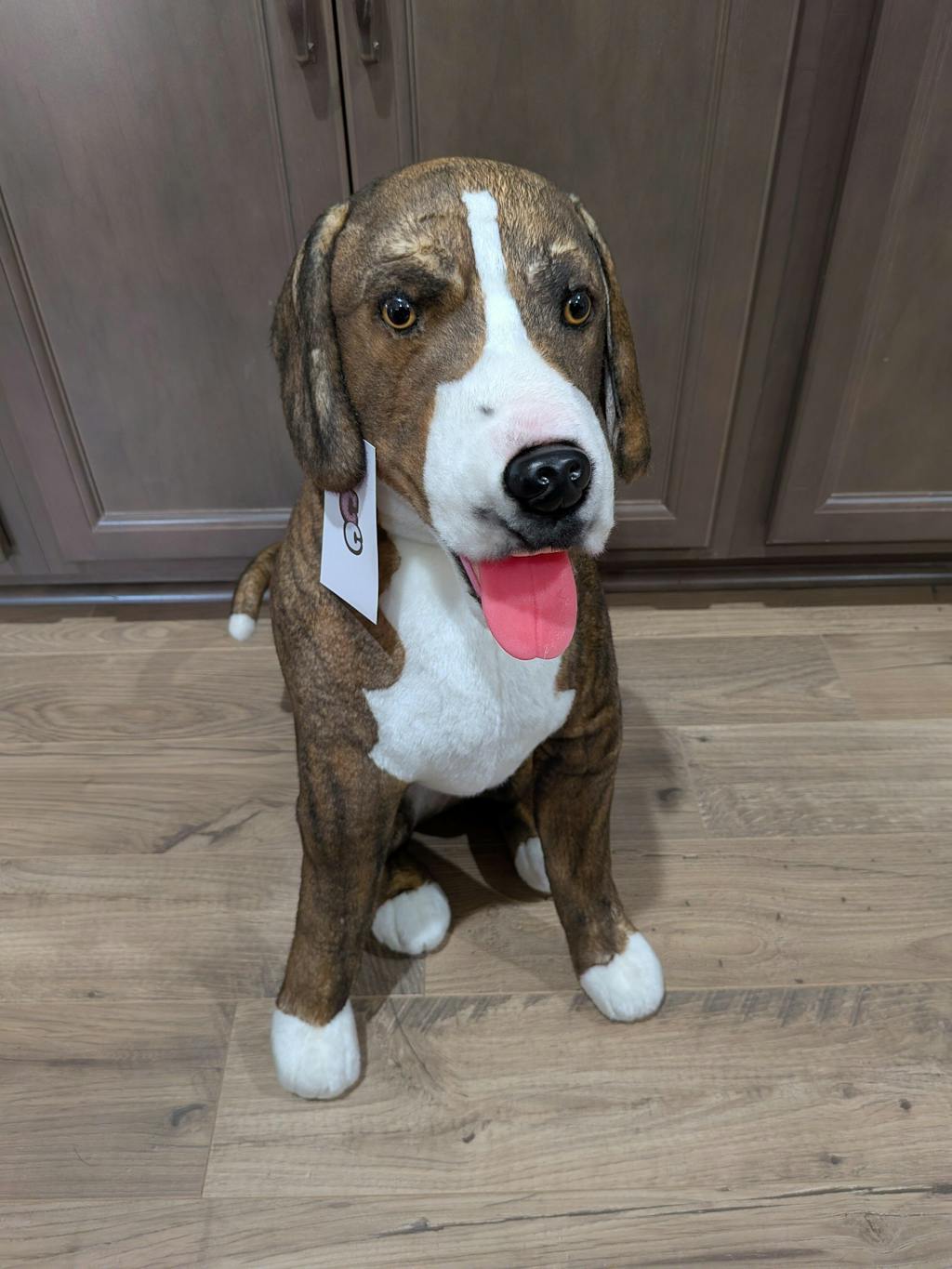 Custom tan dog plush with photo and guarantee badge.