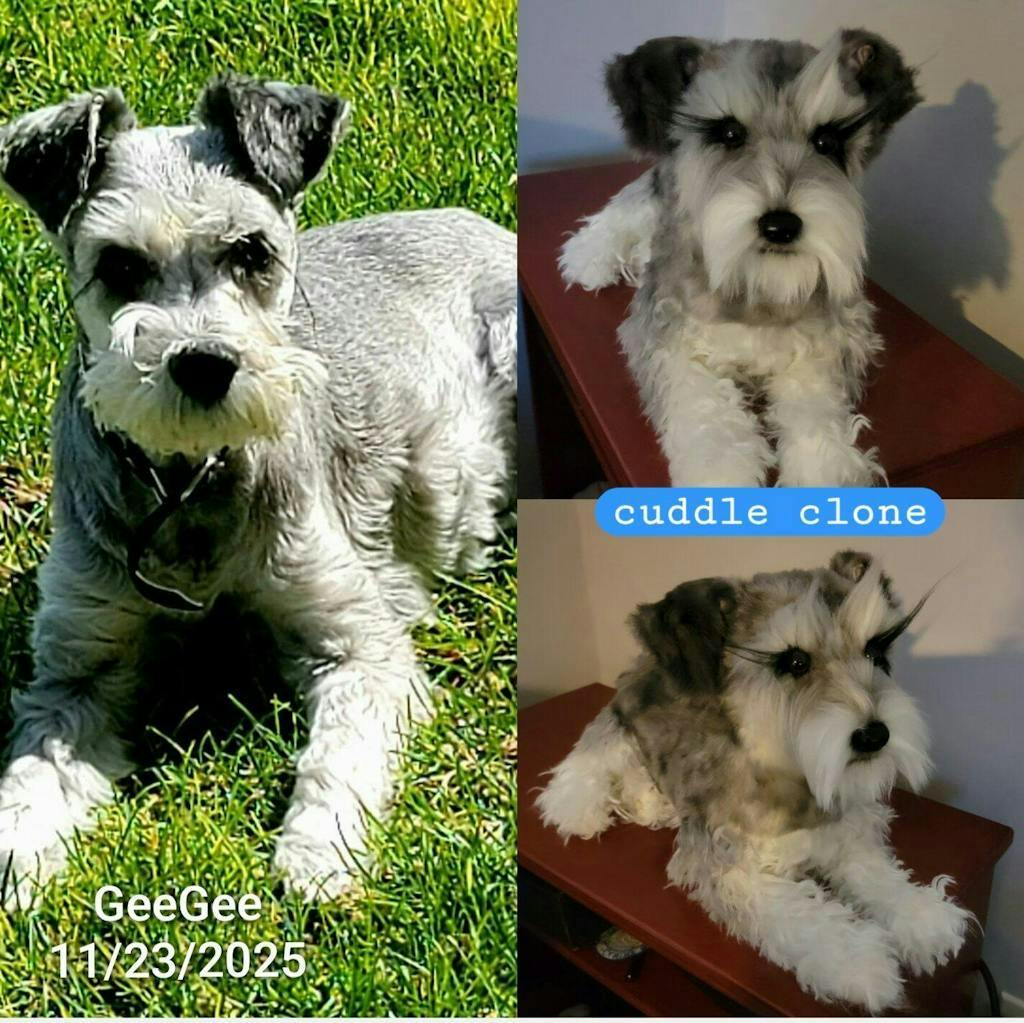 After saying goodbye to GeeGee in November, the grief was overwhelming. I wasn't sure anything could ease the emptiness, but when my Cuddle Clone arrived, it was like getting a piece of her back. The attention to detail is absolutely breathtaking—they captured her perfectly, from her salt-and-pepper coat and bearded schnauzer snout to her petite size and adorable pose. But what truly blew me away was how they nailed her long eyelashes! I had highlighted that feature in my photos and notes, and the artisans went above and beyond to emphasize them just right, making her eyes pop with that same charming, lash-fringed gaze that made GeeGee so unique and irresistible.