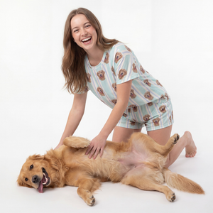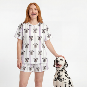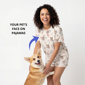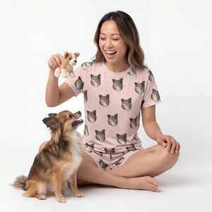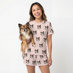 Our custom pet face pajamas are crafted from a soft, lightweight fabric blend designed for all-night comfort. They're machine washable — just turn them inside out and wash on a gentle cold cycle to keep the print looking its best.